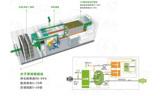 1.高吸、脱附效率,使原本大风量、低浓度的vocs废气,转换成小风量、高浓度的废气,降低后端终处理设备的成本。